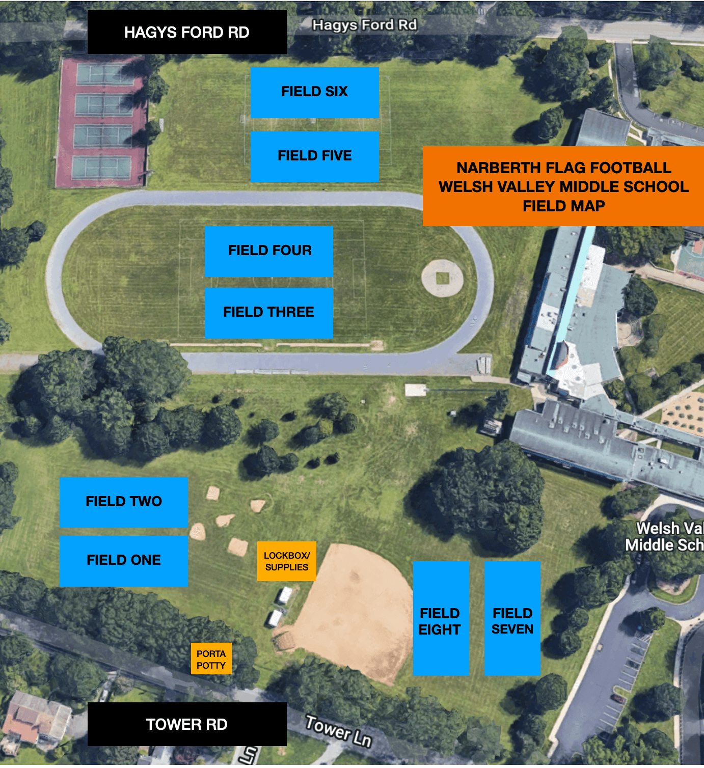 Located at entrance of Field 1 along Tower Rd.
